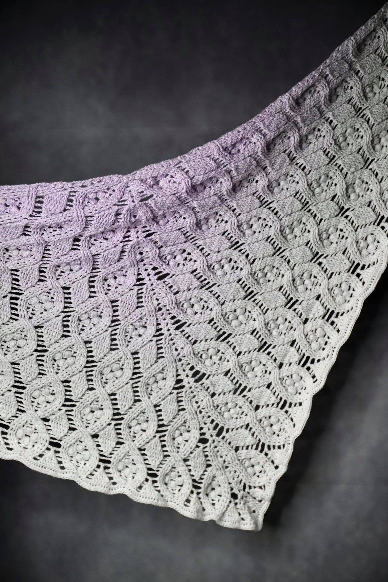 Mielikki is a classic symmetrical triangular shawl made of leaves, flowers and braids.